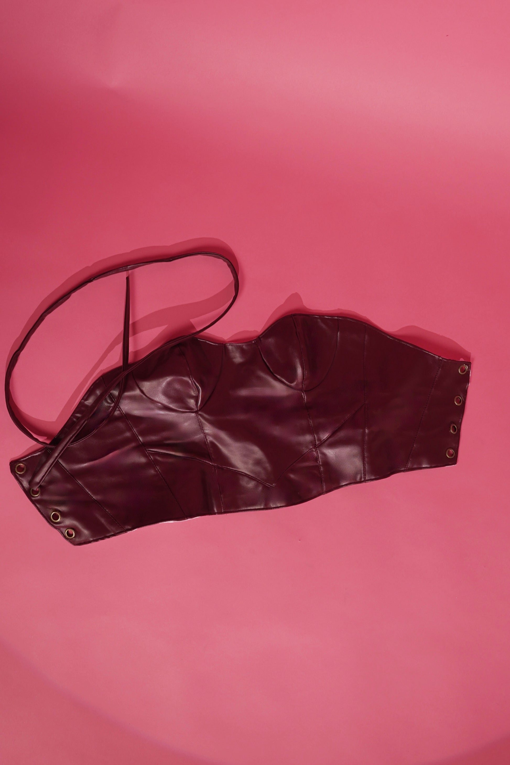 The Rosa corset is crafted from burgundy Nappa-style vegan leather, designed to sculpt and define the waist with a clean, structured silhouette.